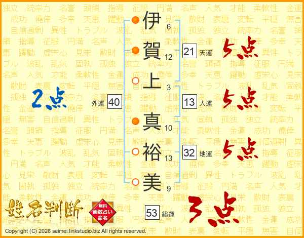 伊(6画)賀(12画)上(3画) 真(10画)裕(13画)美(9画)