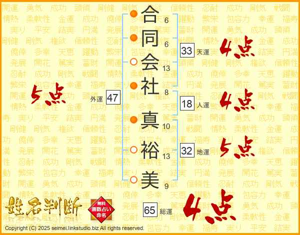 合(6画)同(6画)会(13画)社(8画) 真(10画)裕(13画)美(9画)