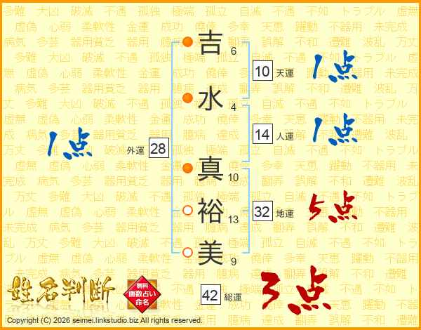 吉(6画)水(4画) 真(10画)裕(13画)美(9画)