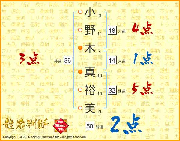 生活面を象徴する運勢です。外部から受ける影響力を表し、結婚運、家庭運や職場、環境への順応性を表します。総運から人運を引いた画数。姓や名が1文字の場合を除く。