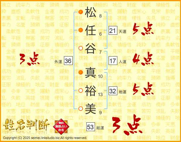 松(8画)任(6画)谷(7画) 真(10画)裕(13画)美(9画)