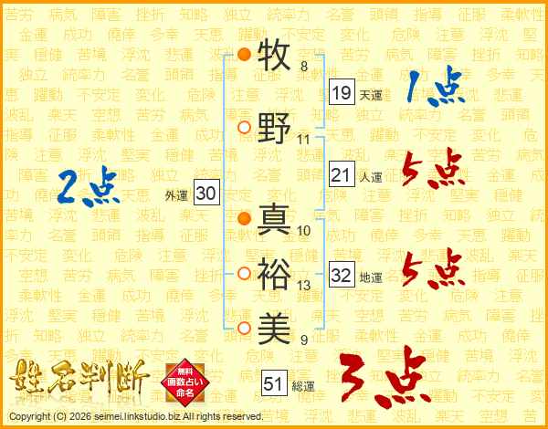 牧(8画)野(11画) 真(10画)裕(13画)美(9画)