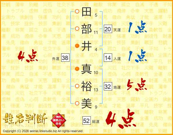 田(5画)部(11画)井(4画) 真(10画)裕(13画)美(9画)