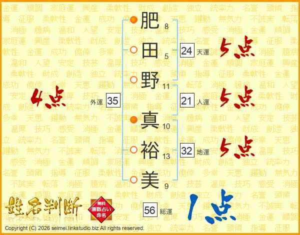 肥(8画)田(5画)野(11画) 真(10画)裕(13画)美(9画)