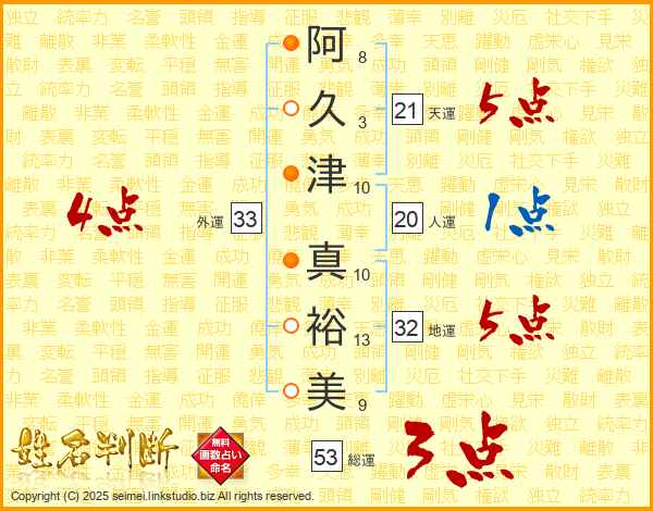 阿(8画)久(3画)津(10画) 真(10画)裕(13画)美(9画)