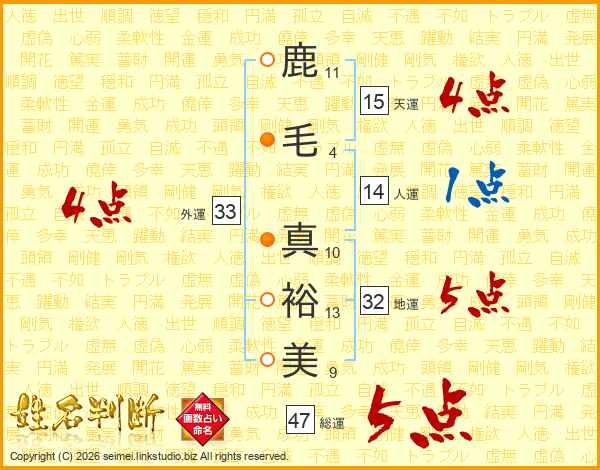 鹿(11画)毛(4画) 真(10画)裕(13画)美(9画)