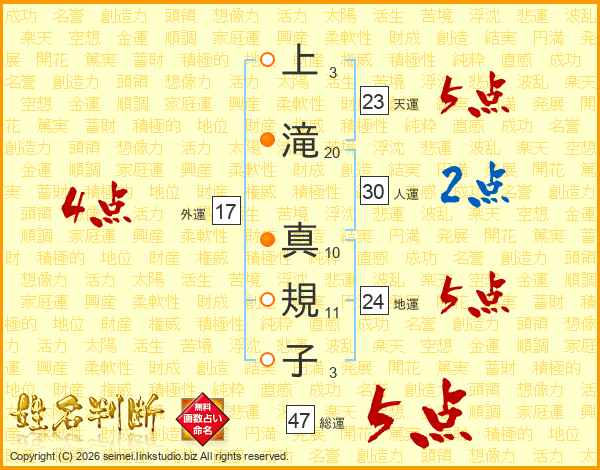 上(3画)滝(20画) 真(10画)規(11画)子(3画)