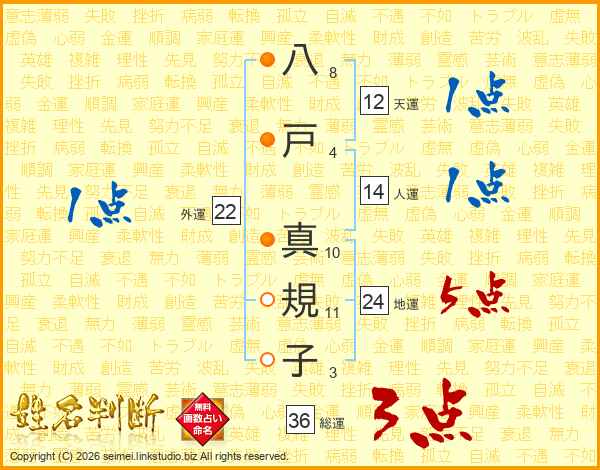 八(8画)戸(4画) 真(10画)規(11画)子(3画)