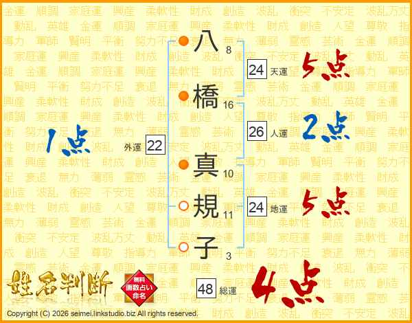 八(8画)橋(16画) 真(10画)規(11画)子(3画)