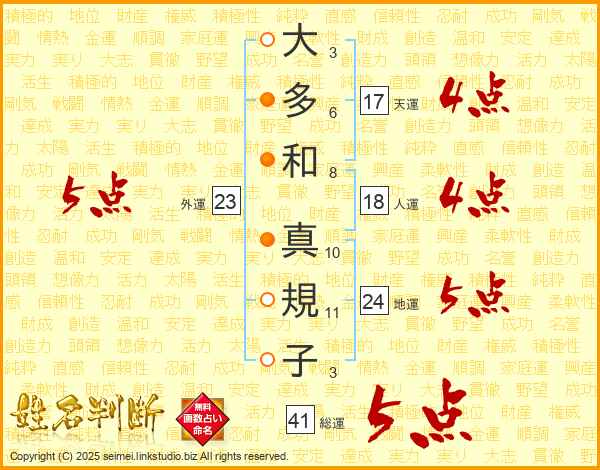 大(3画)多(6画)和(8画) 真(10画)規(11画)子(3画)