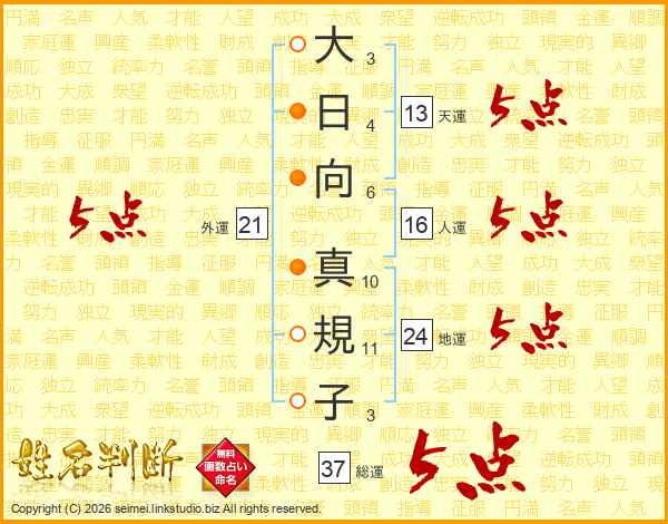 大(3画)日(4画)向(6画) 真(10画)規(11画)子(3画)