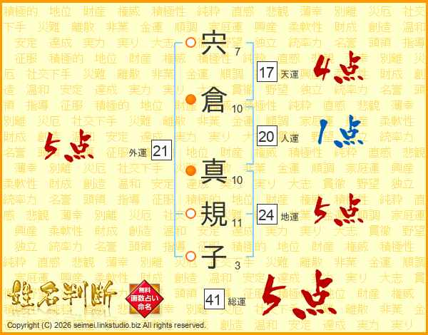 宍倉真規子さんの総運は41画の5点!