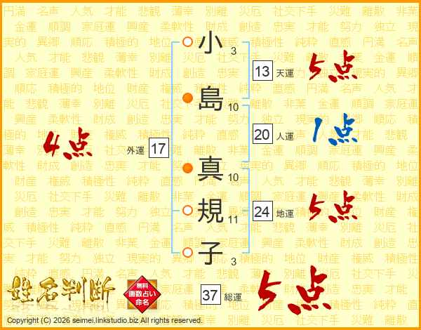 小(3画)島(10画) 真(10画)規(11画)子(3画)