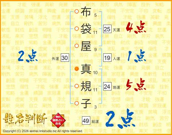 布(5画)袋(11画)屋(9画) 真(10画)規(11画)子(3画)