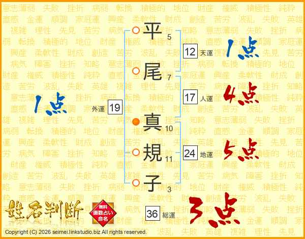 平(5画)尾(7画) 真(10画)規(11画)子(3画)