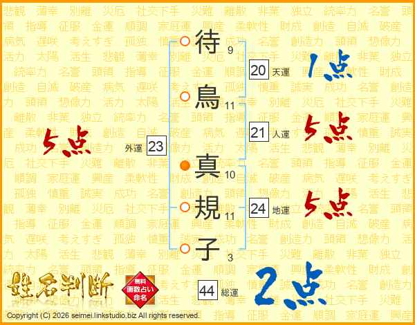 待(9画)鳥(11画) 真(10画)規(11画)子(3画)