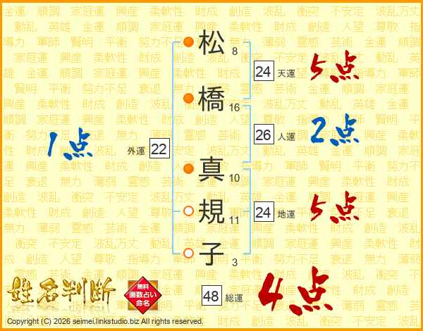 松(8画)橋(16画) 真(10画)規(11画)子(3画)