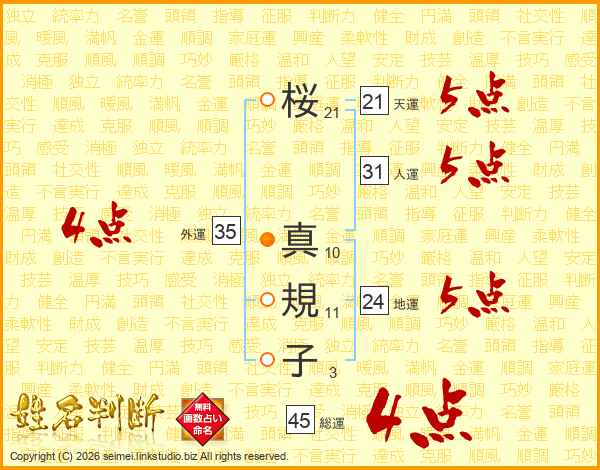 桜(21画) 真(10画)規(11画)子(3画)