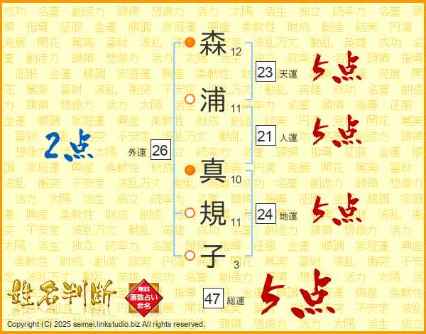 森(12画)浦(11画) 真(10画)規(11画)子(3画)