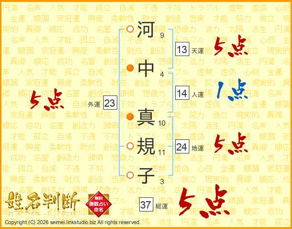 河(9画)中(4画) 真(10画)規(11画)子(3画)