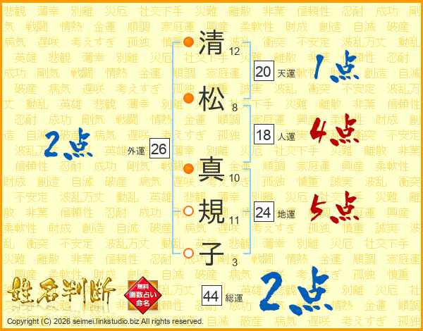 清(12画)松(8画) 真(10画)規(11画)子(3画)