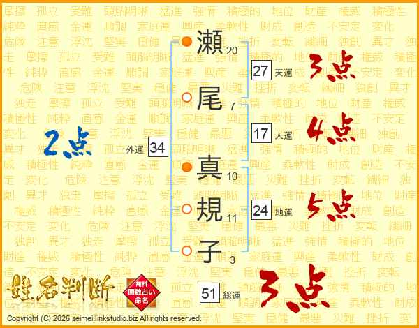 瀬(20画)尾(7画) 真(10画)規(11画)子(3画)