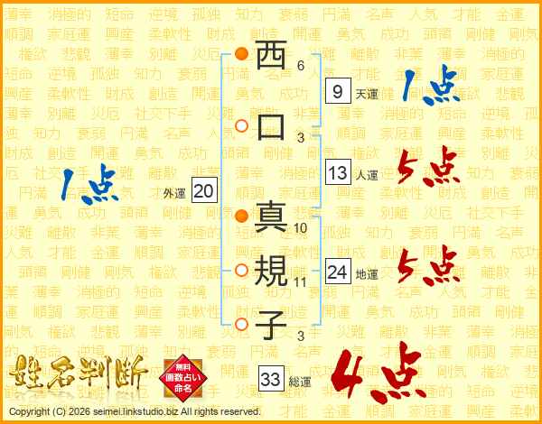 西(6画)口(3画) 真(10画)規(11画)子(3画)
