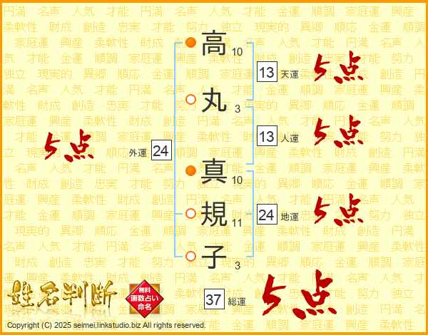 高(10画)丸(3画) 真(10画)規(11画)子(3画)