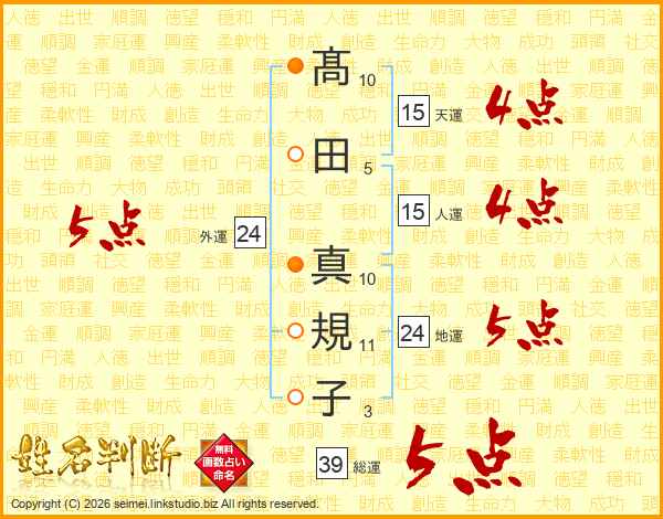 髙(10画)田(5画) 真(10画)規(11画)子(3画)