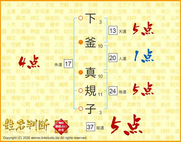 下(3画)釜(10画) 真(10画)規(11画)子(3画)