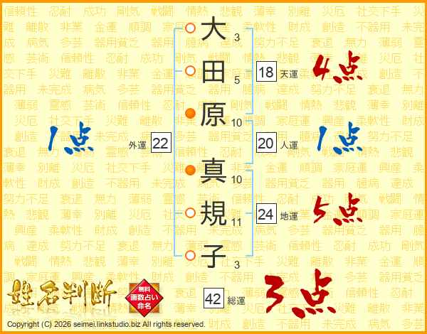 大(3画)田(5画)原(10画) 真(10画)規(11画)子(3画)
