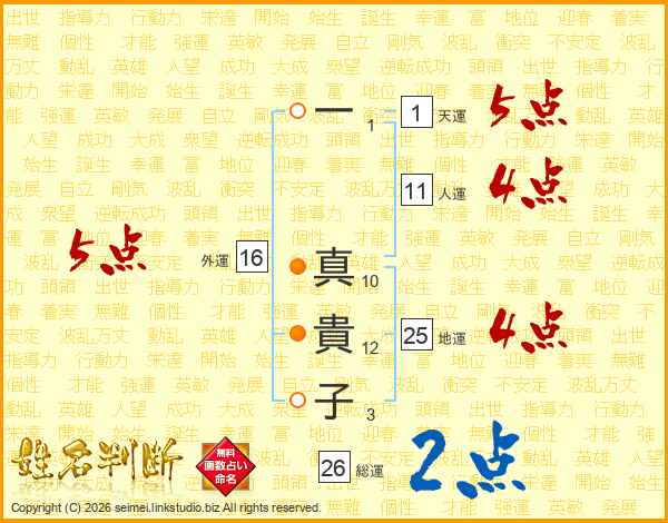 一(1画) 真(10画)貴(12画)子(3画)