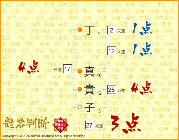 生活面を象徴する運勢です。外部から受ける影響力を表し、結婚運、家庭運や職場、環境への順応性を表します。総運から人運を引いた画数。姓や名が1文字の場合を除く。