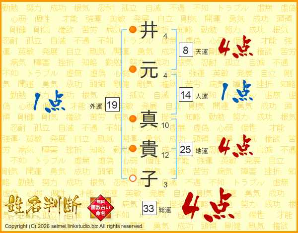 井(4画)元(4画) 真(10画)貴(12画)子(3画)