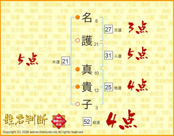 名(6画)護(21画) 真(10画)貴(12画)子(3画)
