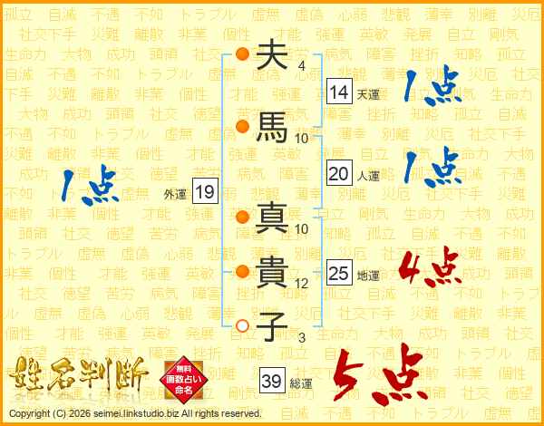 夫(4画)馬(10画) 真(10画)貴(12画)子(3画)