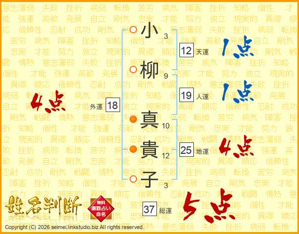 小(3画)柳(9画) 真(10画)貴(12画)子(3画)