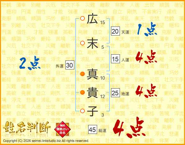 広(15画)末(5画) 真(10画)貴(12画)子(3画)