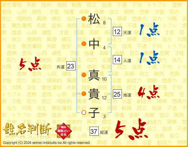 松(8画)中(4画) 真(10画)貴(12画)子(3画)