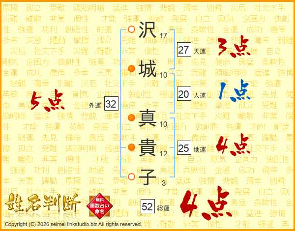 沢(17画)城(10画) 真(10画)貴(12画)子(3画)