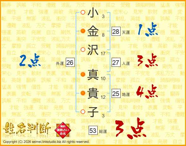 小(3画)金(8画)沢(17画) 真(10画)貴(12画)子(3画)