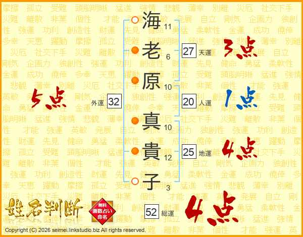 海(11画)老(6画)原(10画) 真(10画)貴(12画)子(3画)
