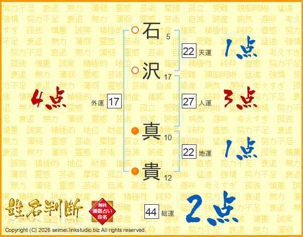 石(5画)沢(17画) 真(10画)貴(12画)