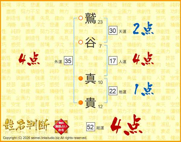 鷲(23画)谷(7画) 真(10画)貴(12画)