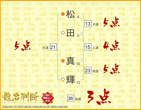 生活面を象徴する運勢です。外部から受ける影響力を表し、結婚運、家庭運や職場、環境への順応性を表します。総運から人運を引いた画数。姓や名が1文字の場合を除く。