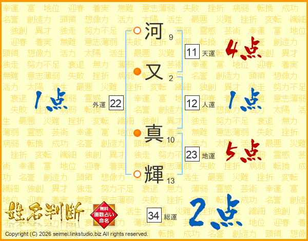あなたの人生を表す1番重要な運勢です。生涯を通じて影響する総合運となり、主に50歳以降の晩年期に影響を及ぼします。苗字と名前の合計画数。
