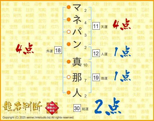 マ(2画)ネ(4画)パ(3画)ン(2画) 真(10画)那(7画)人(2画)