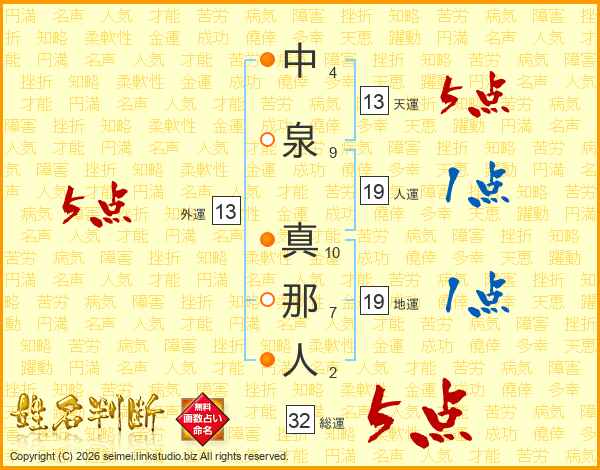 中泉真那人さんの総運は32画の5点!
