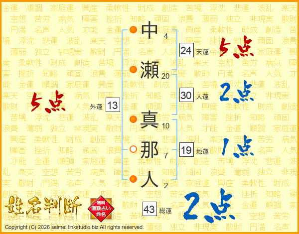 中瀬真那人さんの外運は13画の5点!