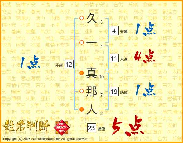 久(3画)一(1画) 真(10画)那(7画)人(2画)